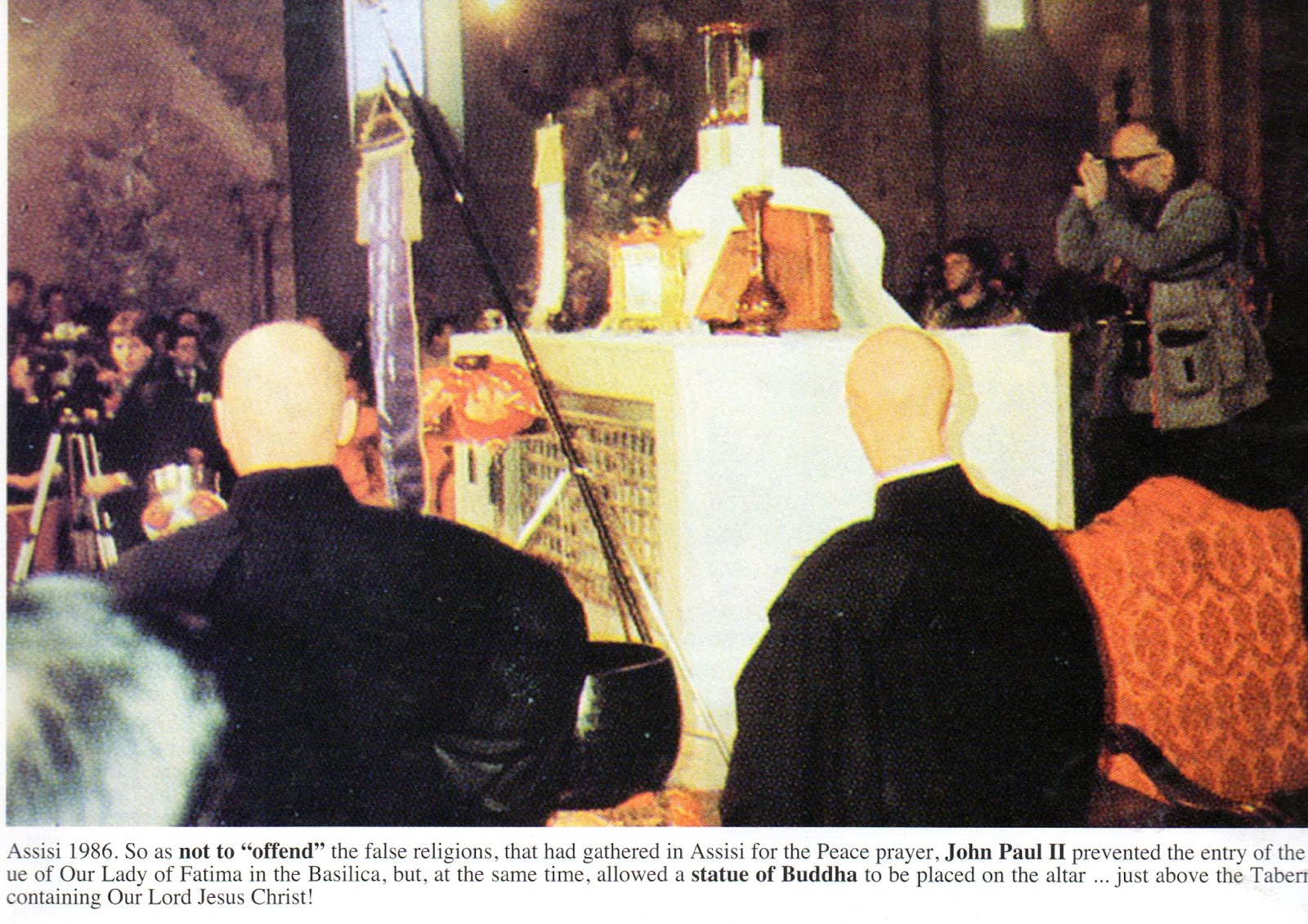 Durante el primer encuentro ecuménico de Asís (se celebra cada año con la presencia de múltiples representantes de cualquier "religión") en donde cada dirigente religioso, incluido Juan Pablo II, "rezó" a su "dios" por la paz del mundo, El "Papa impidió que entrara una imagen de Nuestra Señora de Fátima a la Basílica "para no ofender a las otras religiones, pero permitió que se colocara sobre el Sagrario en el Altar de la Basílica una estatuilla de BUDA.